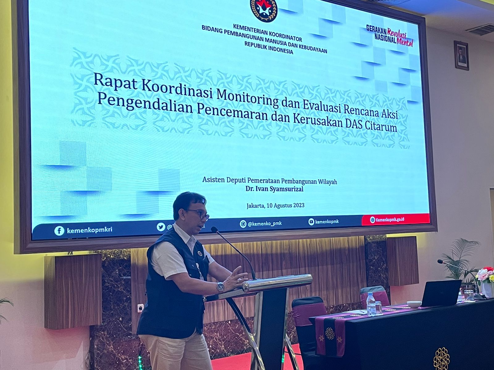 Dalam Rapat Koordinasi Monitoring dan Evaluasi Rencana Aksi Pengendalian Pencemaran dan Kerusakan (PPK) DAS Citarum yang diselenggarakan oleh Kemenko Marves pada 10 Agustus 2023 di Grand Sunshine Resort & Convention, Kabupaten Bandung, Asisten Deputi Pemerataan Pembangunan Wilayah Kemenko PMK Ivan Syamsurizal melaporkan kondisi terkini terkait amanat Perpres 15/2018 Tentang PPK DAS Citarum.