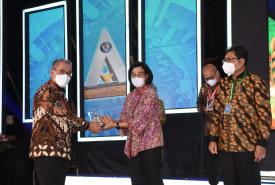 Menteri Keuangan (Menkeu) Sri Mulyani memberikan plakat penghargaan Opini WTP Minimal 10 Kali berturut-turut kepada S