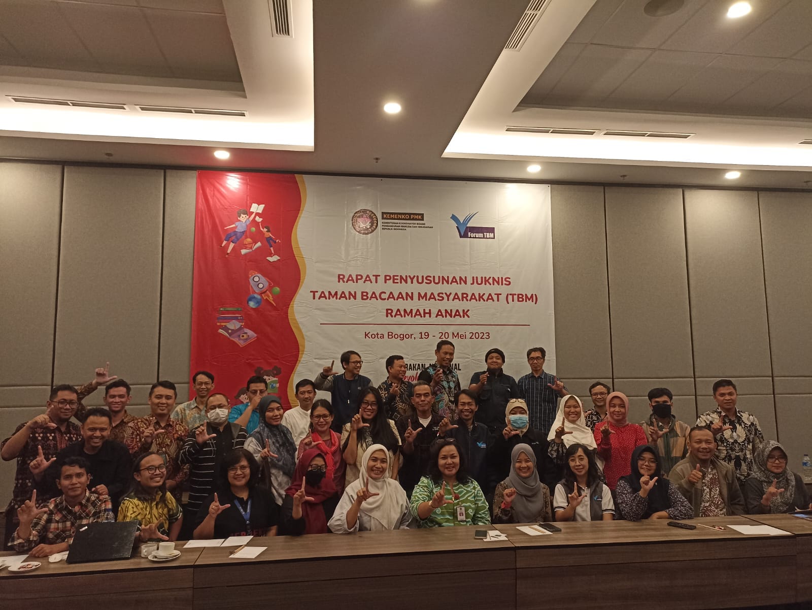 Untuk mendorong hal tersebut di atas, Kemenko PMK bersama Forum Taman Bacaan Masyarakat (Forum TBM) menyelenggarakan Rapat Penyusunan Petunjuk Teknis (Juknis) Taman Bacaan Masyarakat Ramah Anak di Kota Bogor, pada Jumat-Sabtu (19-20/05/2023). Kegiatan diikuti oleh Pengurus Pusat, Pengurus Wilayah, Pengurus Daerah, serta perwakilan Taman Bacaan Masyarakat (TBM) di Indonesia.