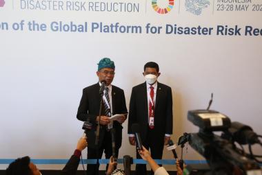 Menko PMK Bersama Kepala BNPB Memberikan Keterangan Pers Setelah Opening Ceremony 7th Session GPDRR