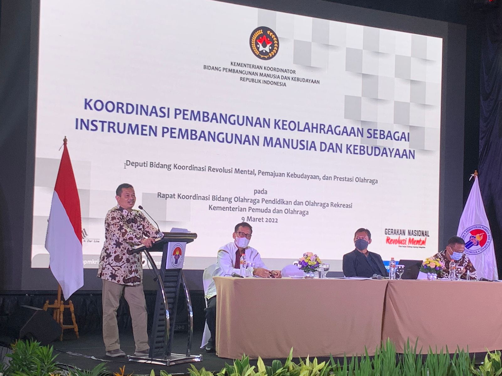 KEMENKO PMK -- Dalam rangka implementasi Perpres No. 86 Tahun 2021 tentang Desain Besar Olahraga, Deputi Bidang Pembudayaan Olahraga Kemenpora menyelenggara Rapat Koordinasi Implementasi Desain Besar Olahraga Nasional (DBON) yang melibatkan Dinas Pemuda dan Olahraga Provinsi seluruh Indonesia, KORMI seluruh Indonesia, Ikatan Guru Olahraga Nasional, akademisi, dan para pemangku kepentingan olahraga lainnya, pada Selasa, 8-10 Maret 2022, di Tangerang, Banten.
