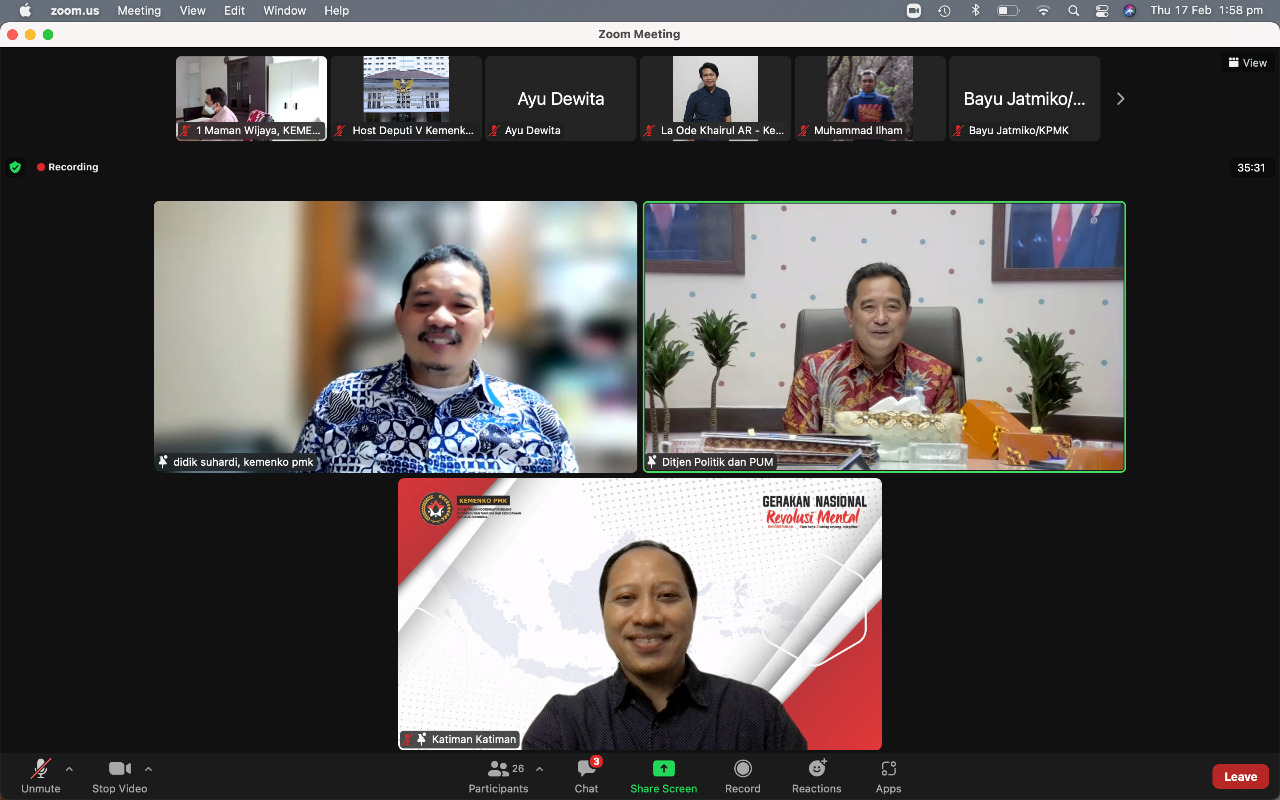 Ditambahkan pula oleh Katiman bahwa Kemenko PMK telah berkoordinasi dengan BPS dan mendorong ICRM dapat diukur secara tahunan. “Untuk mendorong percepatan pembentukan GTD, selain akan dilakukan rapat regional, tahun ini juga akan dihidupkan kembali Pekan Kerja Nyata-Revolusi Mental (PKN-RM) yang menjadi salah satu bentuk apresiasi untuk  Pemda, “jelasnya seraya menyinggung perlunya koordinasi  teknis dalam pelaksanaan GIBe dan GTD Revolusi Mental  2022.