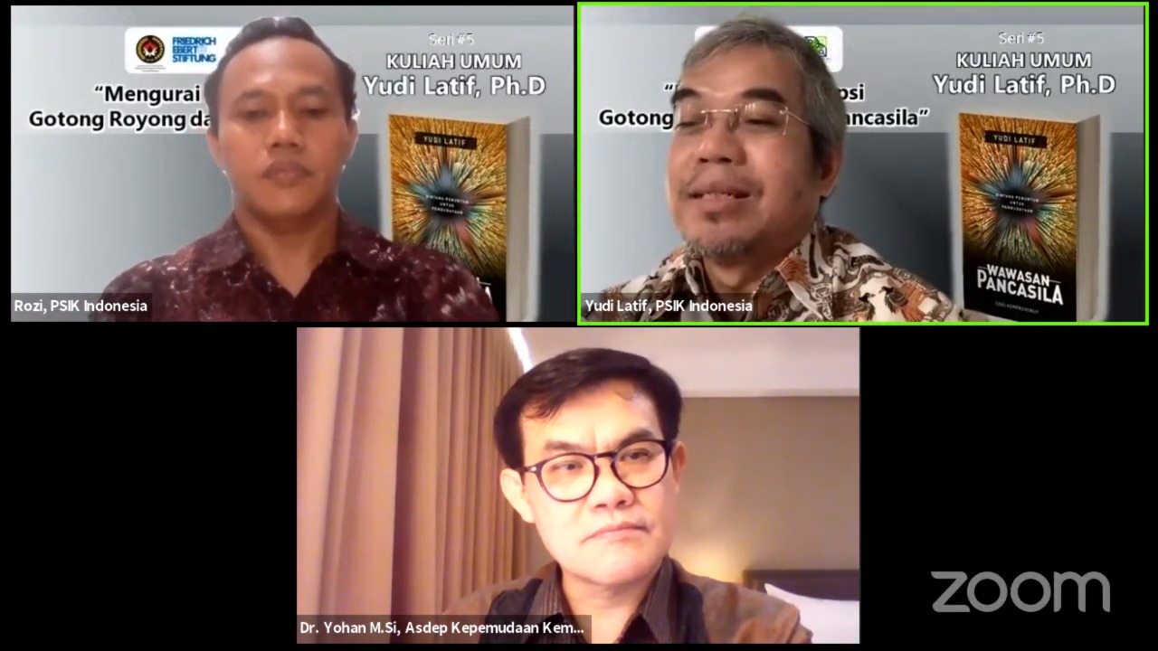 Dalam paparannya, Yudi Latif, PhD menyampaikan bahwa dasar dari semua komponen dalam Pancasila adalah gotong royong. Memang gotong royong tidak tercantum secara eksplisit dalam kelima sila dalam pancasila, namun, gotong royong merupakan intisari dari dasar negara Indonesia tersebut.