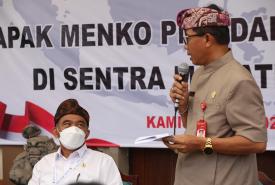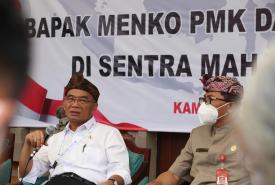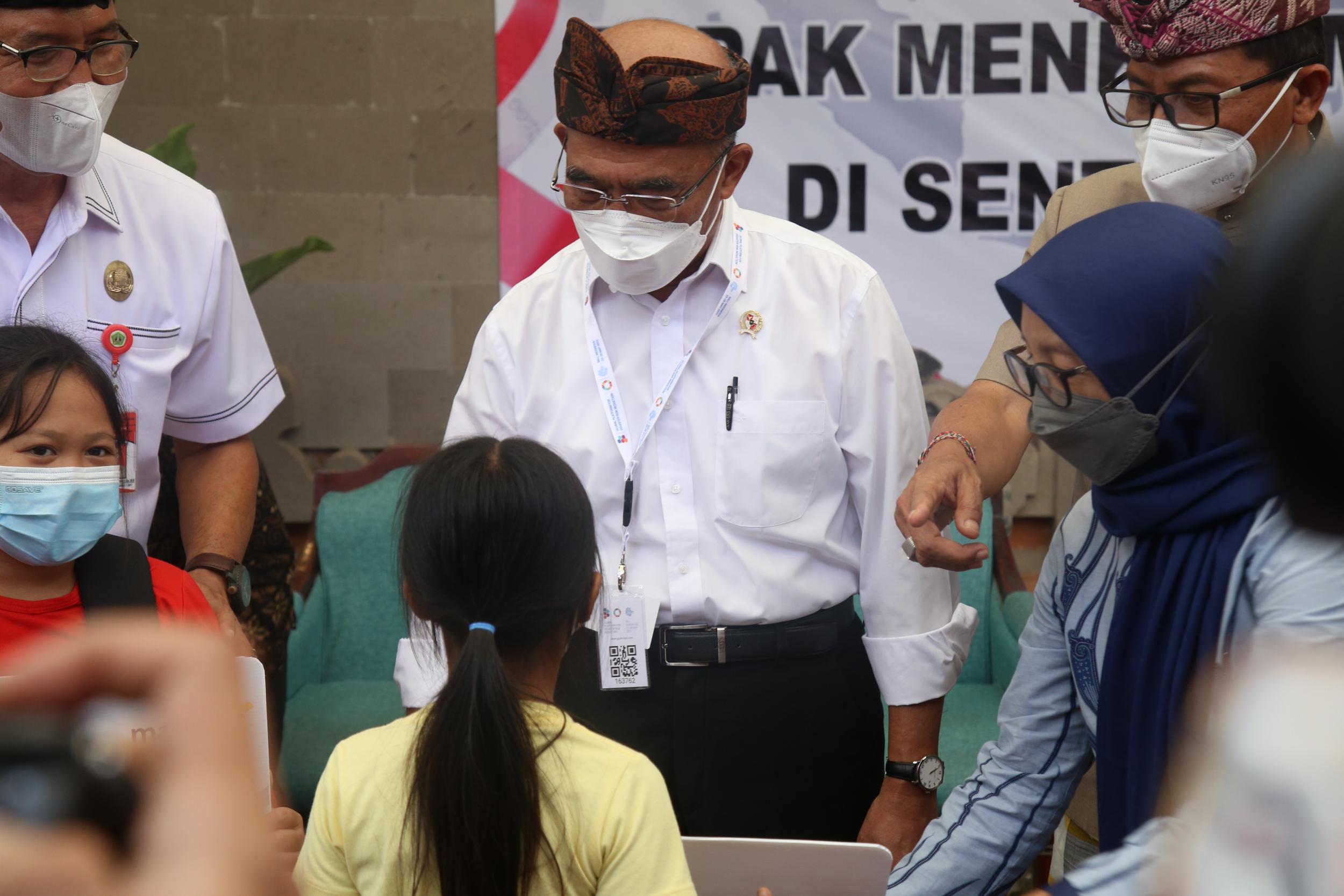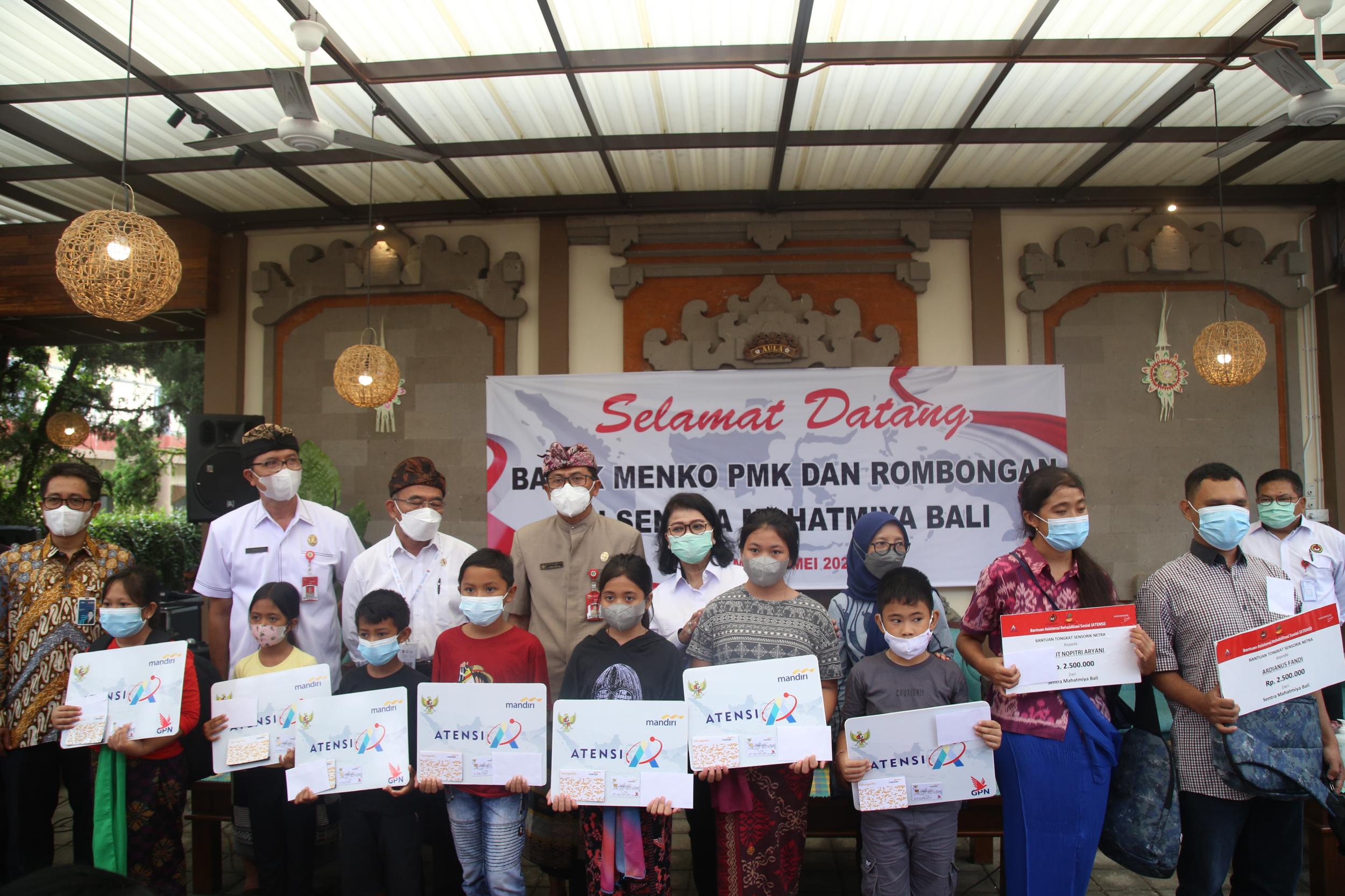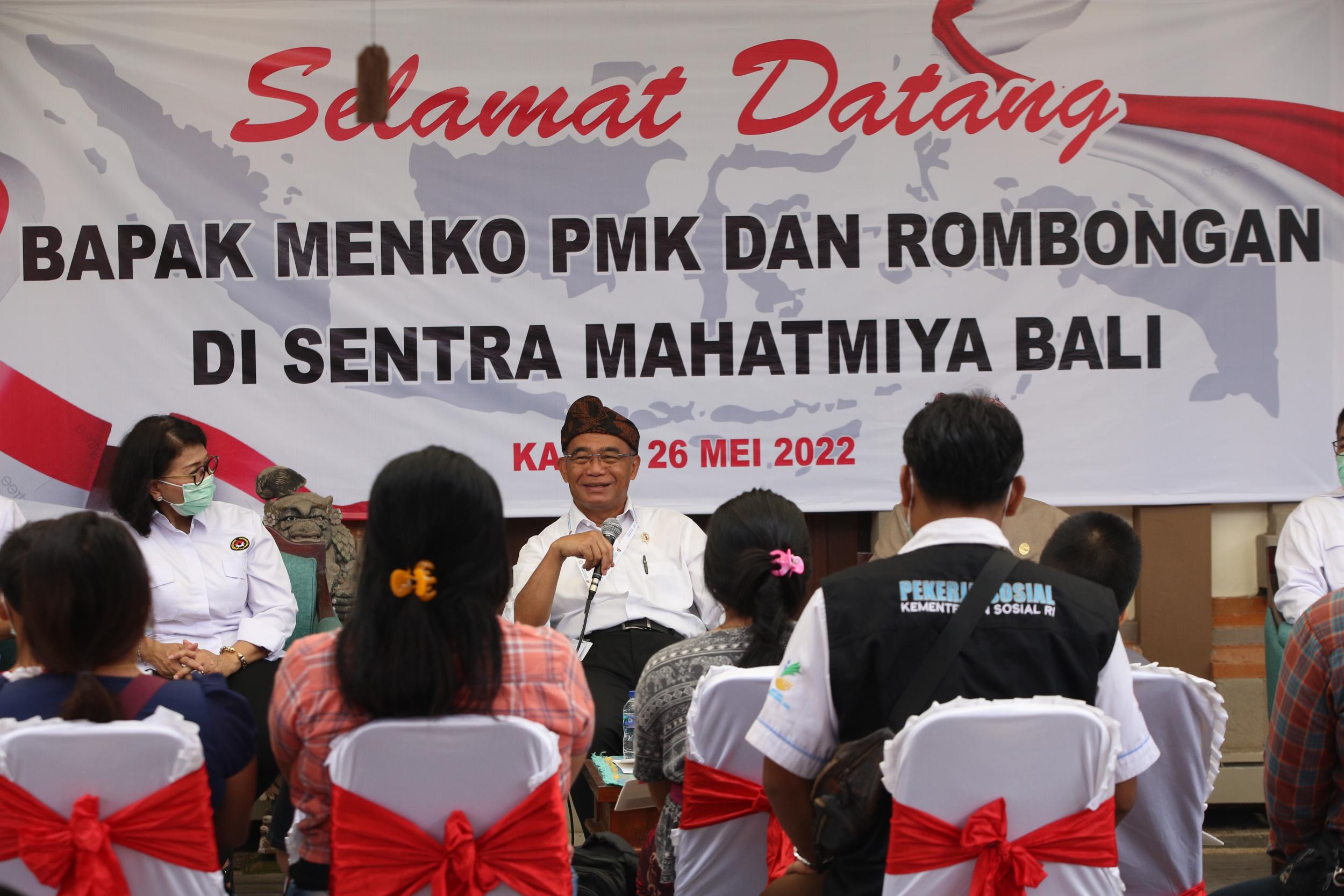 Menteri Koordinator Bidang Pembangunan Manusia dan Kebudayaan, Muhadjir Effendy membantu penyandang disabilitas dan lansia dalam bentuk Bantuan Sosial Khusus seperti kursi roda untuk para lanjut usia dan penyandang disabilitas fisik saat berkunjung ke Sentra Multilayanan Mahatmiya Tambanan Bali, Kamis (27/5).