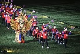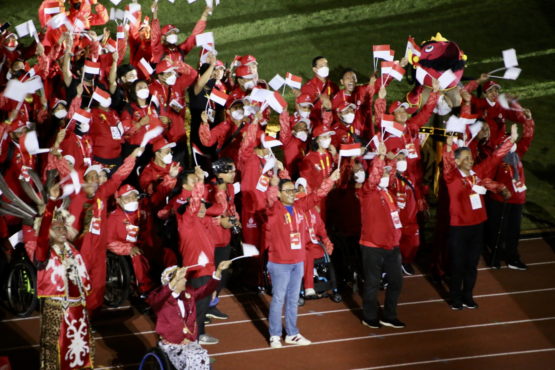 Kemenko PMK - Atlet kontigen Indonesia mengibarkan bendera merah putih pada saat penutupan Asean Paragames ke 11 di Stadion Manahan, Solo, Jawa Tengah (06/08). Presiden Joko Widodo secara resmi menutup perhelatan pesta olahraga Asean Paragames ke 11. Penutupan yang berlangsung secara meriah tersebut diisi oleh musisi ibu kota seperti Yura Yunita, Andien, dan lainnya. Turut menghadiri penutupan Menko PMK dan sejumlah menteri kabinet Indonesia Maju. Tahun 2023 Asean Paragames ke 12 akan diselenggarakan di Kamboja.