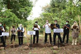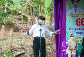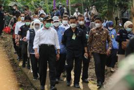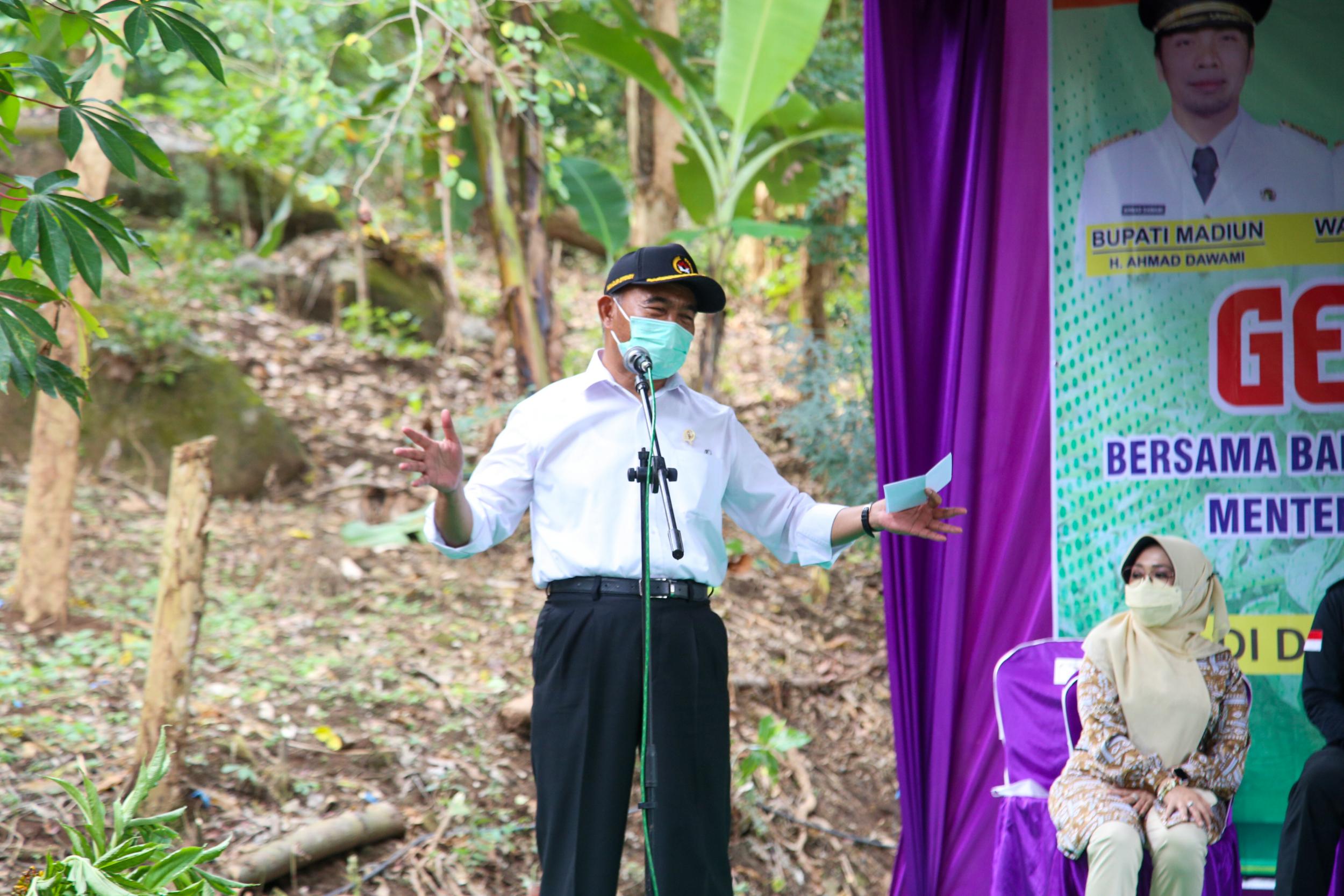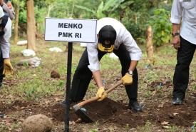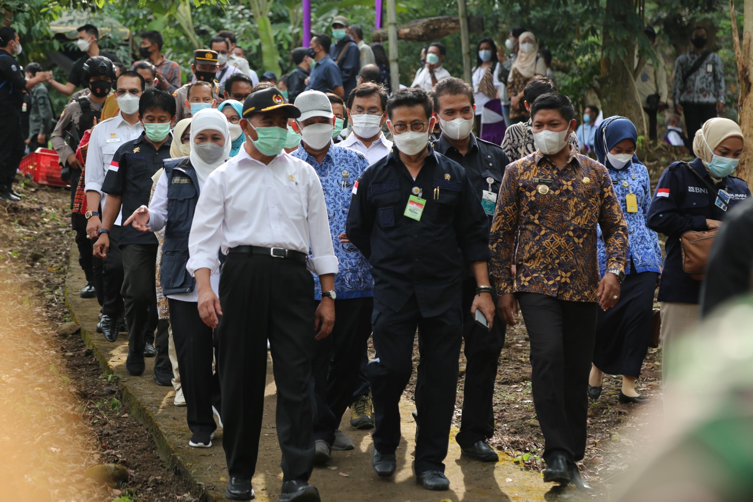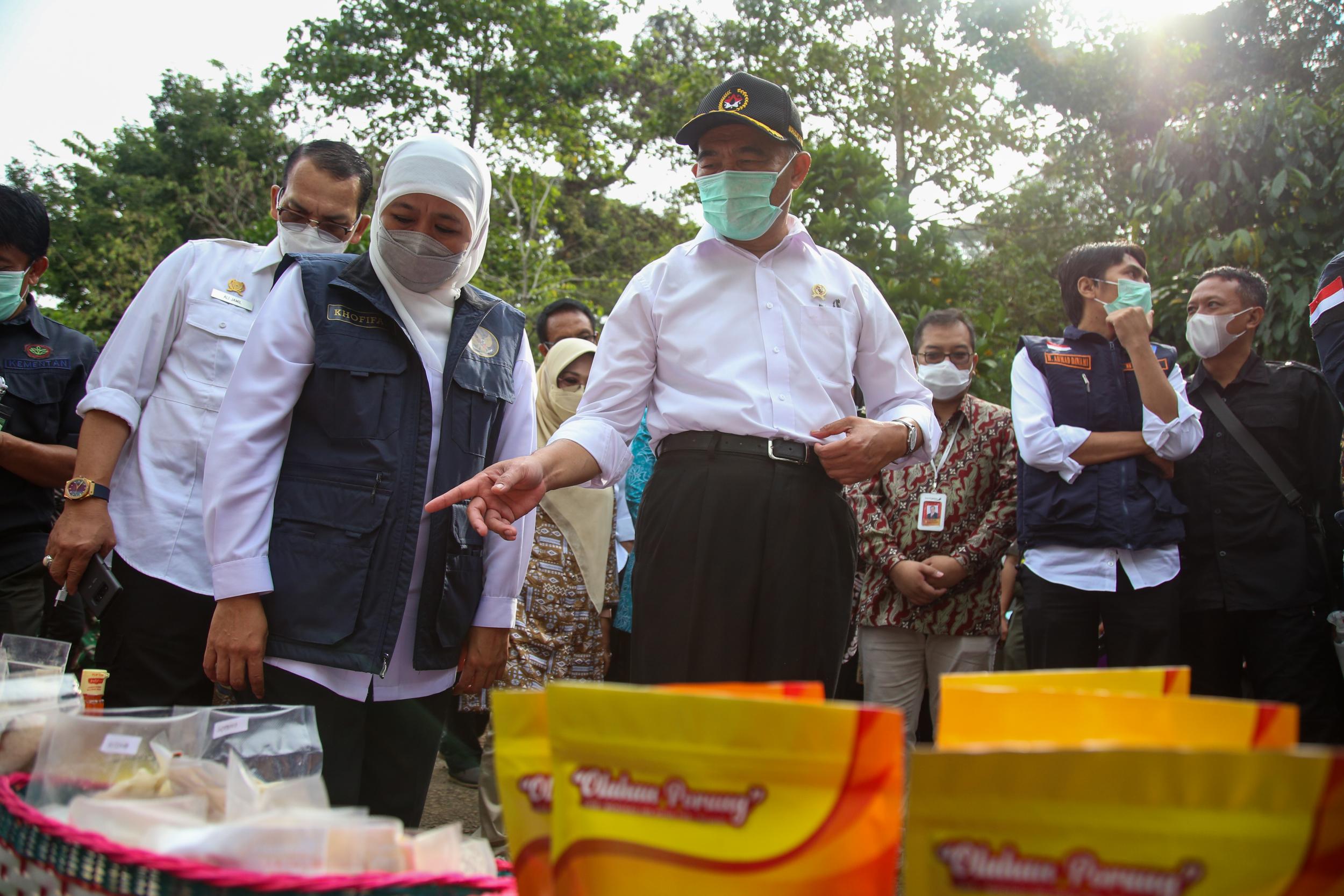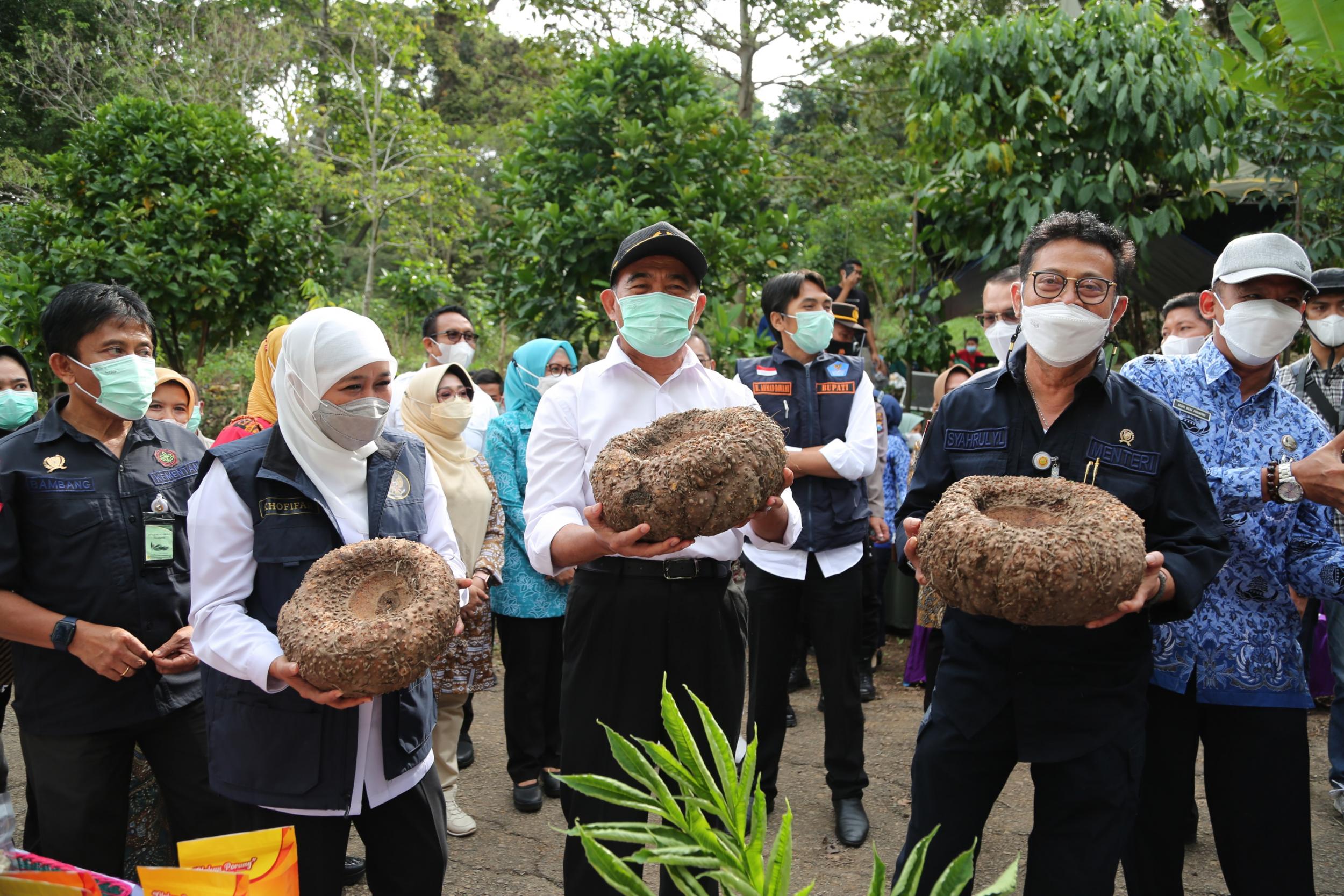 Menteri Koordinator Bidang Pembangunan Manusia dan Kebudayaan Muhadjir Effendy bersama Menteri Pertanian Syahrul Yasin Limpo dan Gubernur Jawa Timur Khofifah melakukan panen porang di sentra tanaman di Desa Klangon, Kecamatan Saradan, Kabupaten Madiun (17/5).