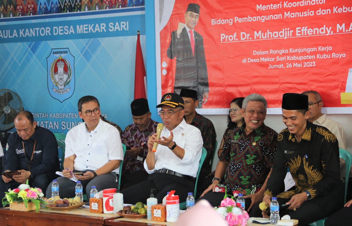 KEMENKO PMK -- Menteri Koordinator Bidang Pembangunan Manusia dan Kebudayaan (Menko PMK) Muhadjir Effendy kembali blusukan ke Desa Mekar Sari, Kabupaten Kubu Raya, Provinsi Kalimantan Barat, pada Jum’at (26/5) guna memastikan penanganan kemiskinan ekstrem dan prevalensi stunting terus berjalan dengan baik.
