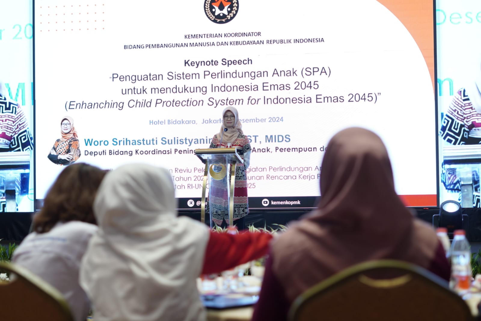 Pernyataan tersebut disampaikan Deputi Woro, yang akrab disapa Lisa, dalam kegiatan Reviu Pelaksanaan Kegiatan Perlindungan Anak Program Kerjasama Pemerintah RI-UNICEF Tahun 2024 dan Penyusunan Rencana Kerja Perlindungan Anak Program Kerjasama Pemerintah RI-UNICEF Tahun 2025 yang diselenggarakan Kementerian PPN/Bappenas di Hotel Bidakara, Senin (9/12).