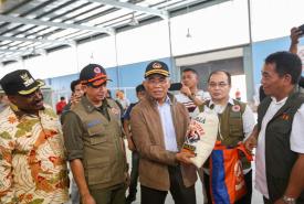 Menko PMK Muhadjir Effendy bersama Kepala BNPB Suharyanto memberikan bantuan sosial secara simbolis di Bandara Mozes