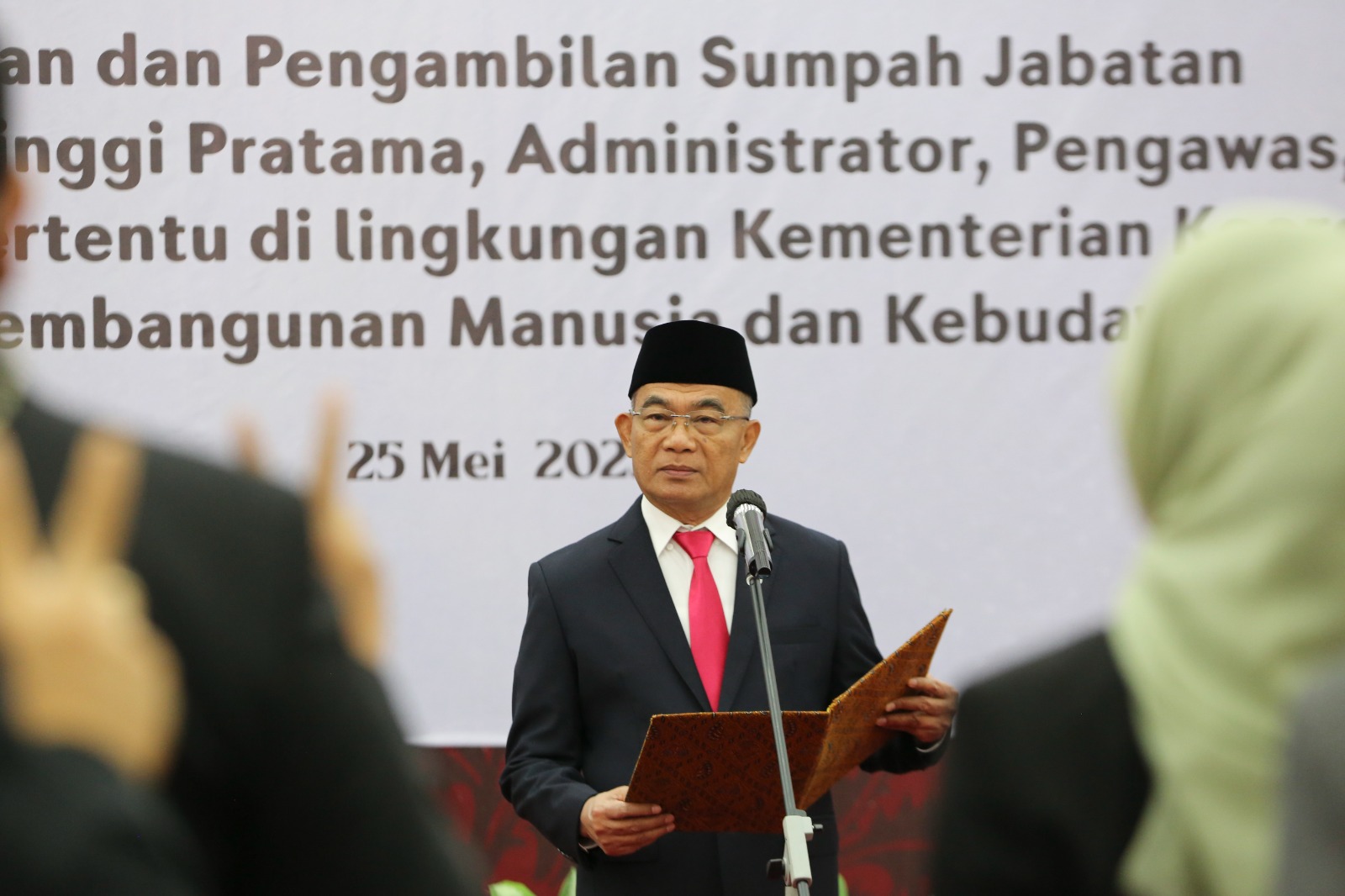 KEMENKO PMK -- Menteri Koordinator Bidang Pembangunan Manusia dan Kebudayaan (Menko PMK) Muhadjir Effendy melakukan Pelantikan dan Pengambilan Sumpah Jabatan Pimpinan Tinggi Pratama, Administrator, Pengawas, dan Fungsional Tertentu di lingkungan Kementerian Koordinator Bidang Pembangunan Manusia dan Kebudayaan (Kemenko PMK) pada Rabu (24/5/2023) di Aula Heritage Kemenko PMK.