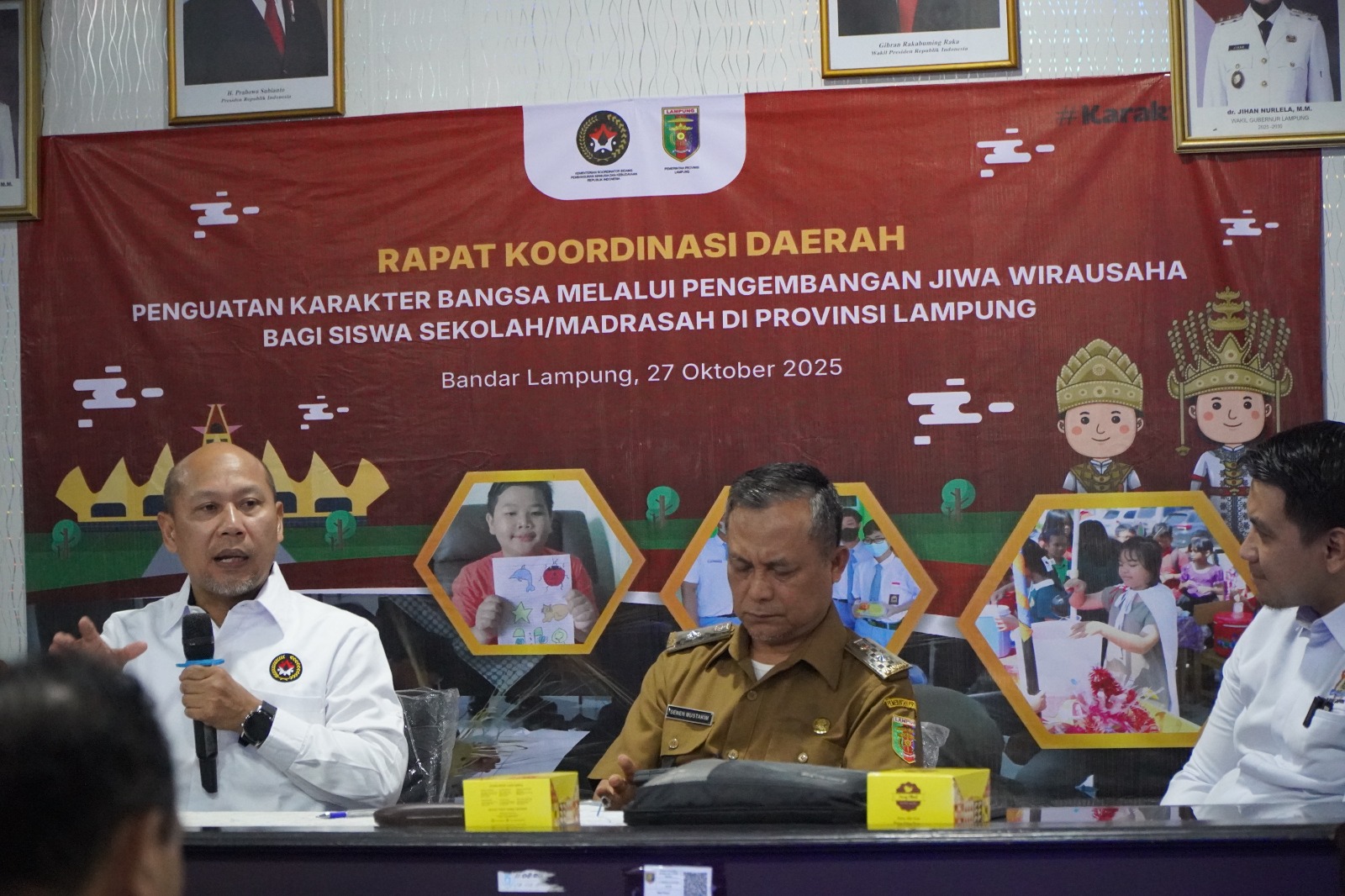 Hal tersebut disampaikan Deputi Bidang Koordinasi Penguatan Karakter dan Jati Diri Bangsa Kemenko PMK, Warsito, saat membuka Rapat Koordinasi Daerah (Rakorda) Penguatan Karakter Bangsa melalui Pengembangan Jiwa Kewirausahaan bagi Siswa Sekolah dan Madrasah di Aula Bhineka Tunggal Ika, Badan Kesbangpol Provinsi Lampung, pada Senin (27/10/2025).