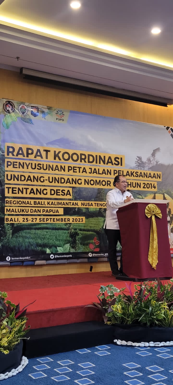Kementerian Koordinator Bidang Pembangunan Manusia dan Kebudayaan melalui Deputi Bidang Koordinasi Pemerataan Pembangunan Wilayah dan Penanggulangan Bencana melaksanakan rapat koordinasi Penyusunan Peta Jalan Pelaksanaan Undang-Undang Nomor 6 Tahun 2014 tentang Desa di Vouk Hotel and Suites Bali, 25-27 September 2023.