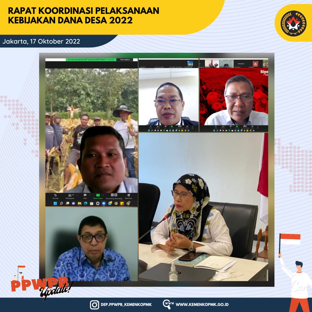 Senin (17/10). Kedeputian Bidang Koordinasi Pemerataan Pembangunan Wilayah dan Penanggulangan Bencana melalui Asisten Deputi Pemberdayaan Kawasan dan Mobilitas Spasial melaksanakan rapat koordinasi pelaksanaan kebijakan Dana Desa Tahun 2022.  Pada pengantarnya Mustikorini Indrijatiningrum selaku Asdep Pemberdayaan Kawasan dan Mobilitas Spasial, menekankan bahwa arahan Presiden yang terkait dengan penggunaan Dana Desa harus dikawal dengan baik. “Dana Desa harus dikelola, dimanfaatkan, serta di realisasikan dengan sebaik mungkin sehingga dapat memacu pertumbuhan ekonomi di desa dan secara keseluruhan akan meningkatkan pertumbuhan ekonomi nasional” ulang Indri sebagaimana arahan Presiden pada rapat Apdesi.
