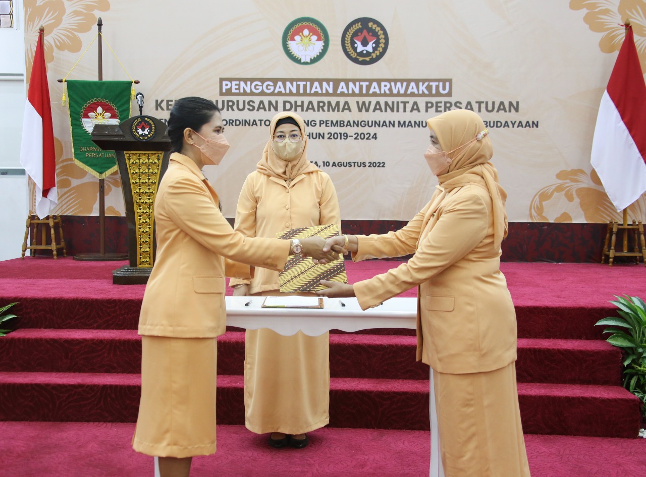 KEMENKO PMK – Dharma Wanita Persatuan  Kementerian Koordinator Bidang Pembangunan Manusia dan Kebudayaan RI (DWP Kemenko PMK), hari ini melaksanakan serah terima jabatan dari dari Ketua DWP Kemenko PMK periode 2019-2022, Hanu Rafia Suprapto kepada DWP Kemenko PMK periode 2022-2024, Nurul Anugrasari Andie. Kegiatan tersebut disaksikan langsung oleh Penasihat DWP Kemenko PMK, Suryan Widati Muhadjir.