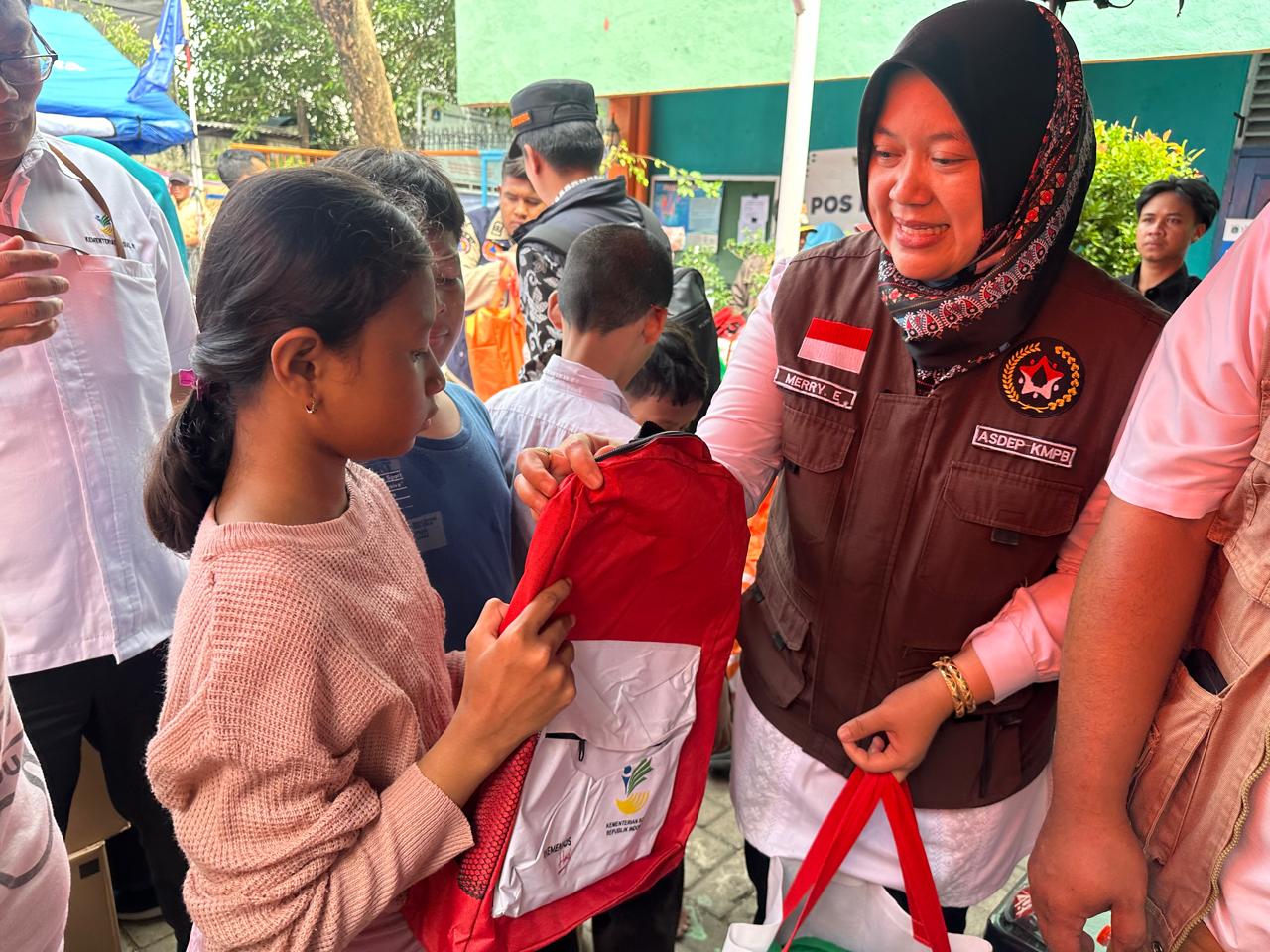 Dari kunjungan ini, Asdep Merry menyerahkan sejumlah bantuan dari Kementerian Sosial berupa 100 lembar kasur lipat, 100 lembar selimut, 100 paket family kit, 100 paket kidsware, dan 100 paket kit sekolah.