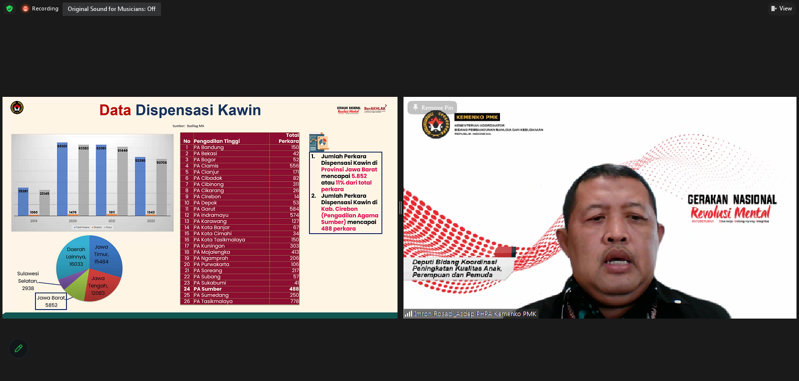 “Mohon ada sinergi antar K/L dan perangkat daerah, termasuk diantaranya Kemenag, Pengadilan Negeri, dan Kemendikbudristek serta Dinas Pendidikan, dan Dinas P3APKB sebagai pintu masuk Pencegahan Perkawinan Anak melalui dispensasi perkawinan anak dan bimbingan remaja usia sekolah,” ucap Imron.