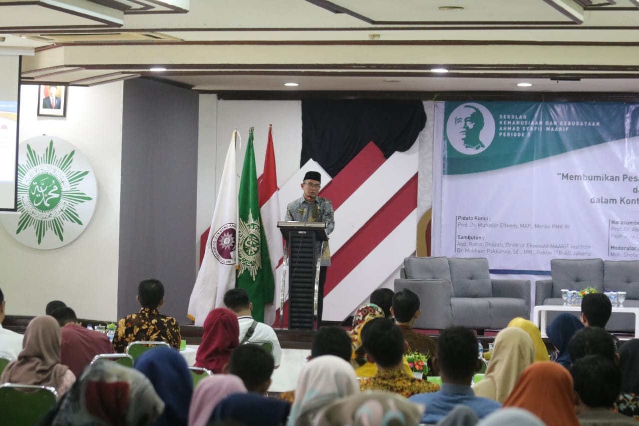 Tangerang Selatan (13/12)--- Menjadi Pemikir yang baik dan unggul seperti Tokoh Muhammadiyah, Ahmad Syafii Maarif harus diiringi dengan kemampuan menulis dan keterampilan berbicara yang baik juga. Semua itu dapat diasah dengan mulai membiasakan diri lewat banyak membaca aneka macam literatur serta penguasaan bahasa asing. “Butuh jalan panjang untuk dapat menjadi seorang Pemikir seperti Buya (Ahmad Syafii Maarif—red). Saya coba memahami pemikiran Beliau itu dengan membaca tesisnya lalu berhubungan baik. Dari Buya, Saya belajar banyak tentang kemanusiaan, toleransi, keberagaman, keislaman secara utuh, dan sebagainya. Anak-anak muda memang sudah seharusnya juga dapat mempelajari semua pemikiran Buya,” ujar Menko PMK, Muhadjir Effendy, Jumat pagi saat menjadi Pembicara Kunci pada Seminar Pembukaan Sekolah Kemanusiaan dan Kebudayaan Ahmad Syafii Maarif (SKK-ASM) yang digagas oleh Maarif Institute di Aula lt.5 gedung ITB Ahmad Dahlan, Ciputat Timur, Tangerang Selatan.