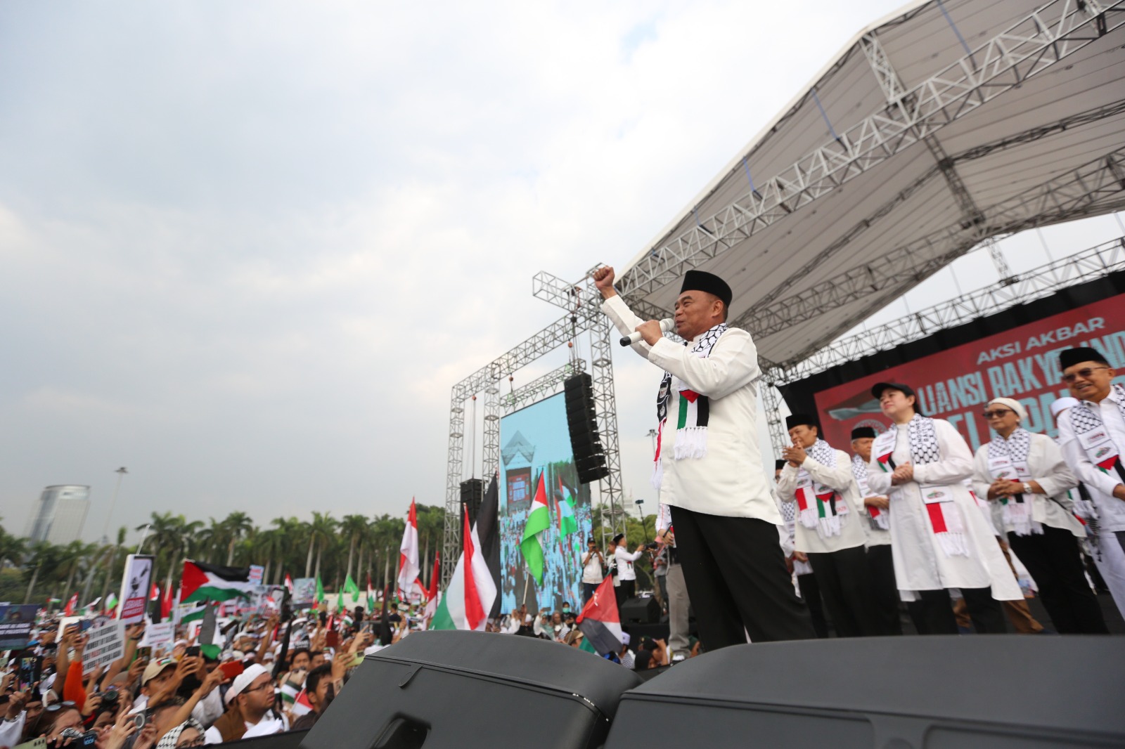 KEMENKO PMK -- Menteri Koordinator Bidang Pembangunan Manusia dan Kebudayaan (Menko PMK) Muhadjir Effendy menghadiri kegiatan "Aksi Akbar: Aliansi Rakyat Indonesia Bela Palestina", di Monumen Nasional Jakarta, pada Minggu (5/11/2023).