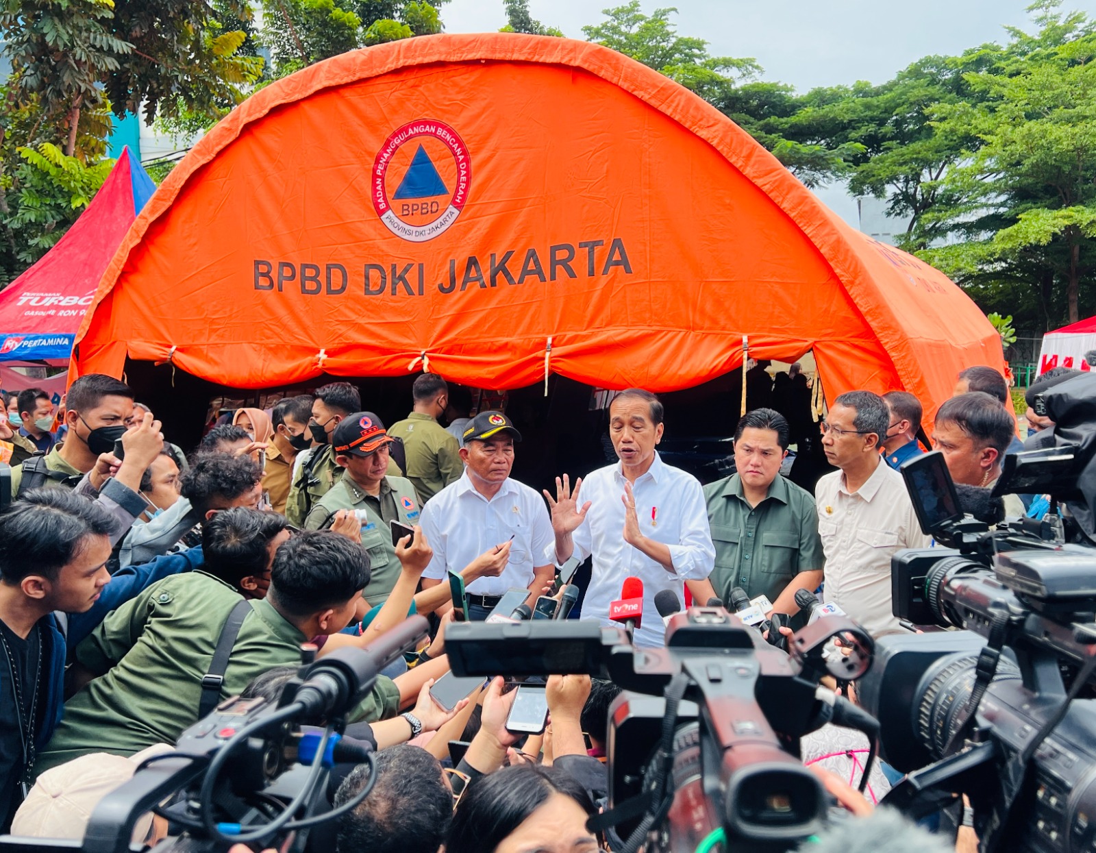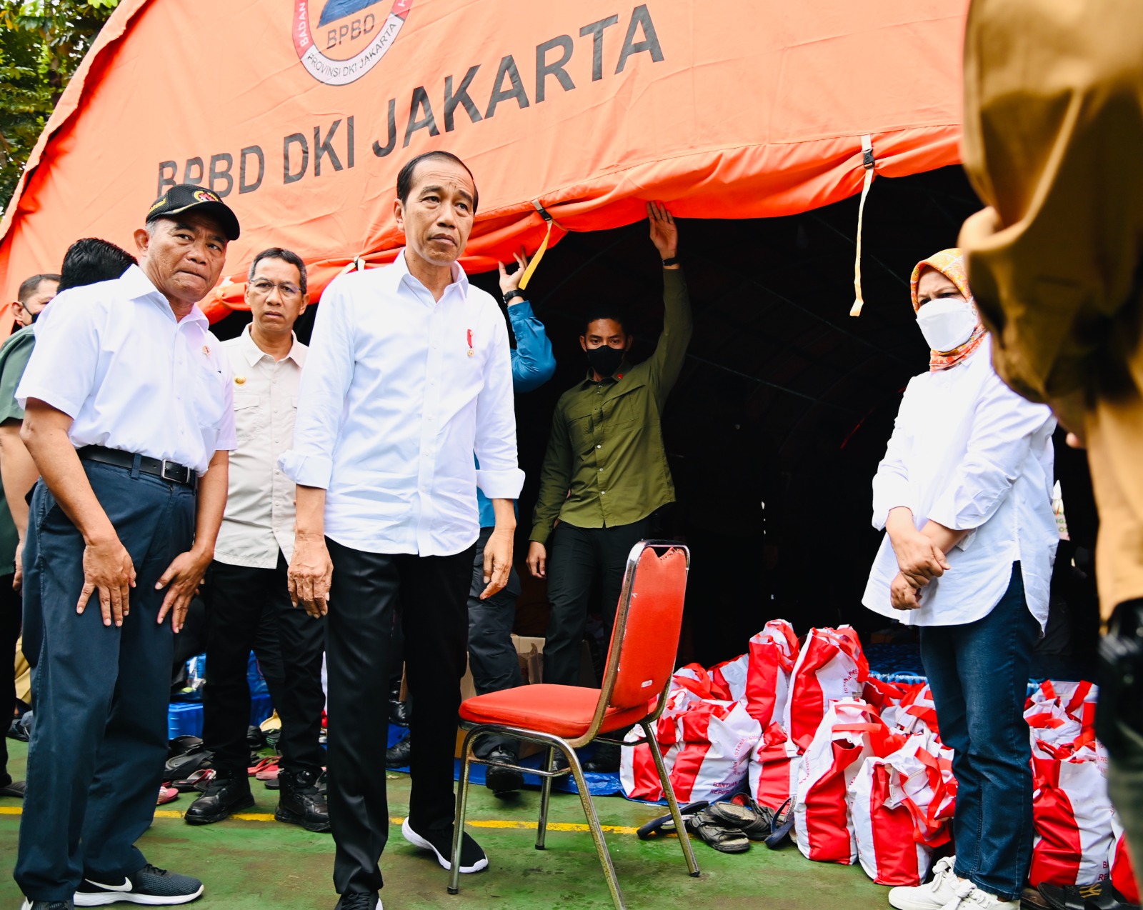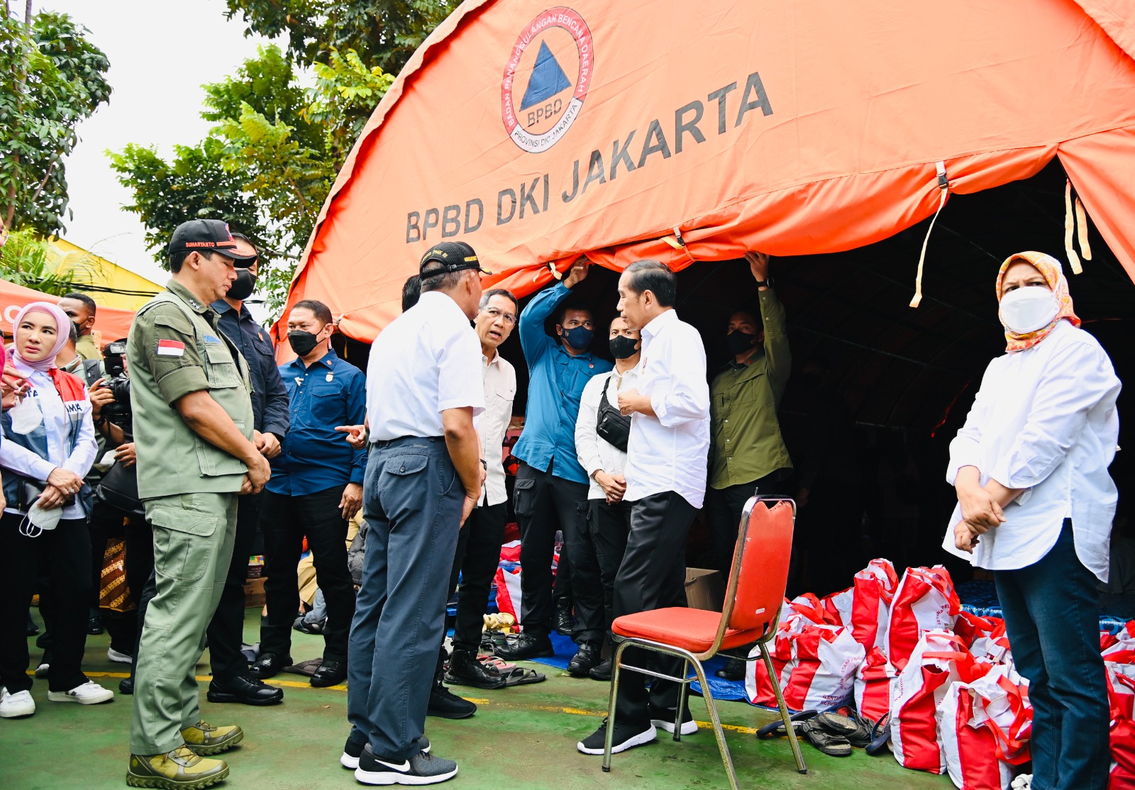 KEMENKOPMK-Menko PMK pada Minggu (5/03) mendampingi Presiden Jokp Widodo mengunjungi posko pengungsi korban kebakaran Depo Pertamina Plumpang, di RPTRA Rasela, Rawa Badak Selatan, Koja, Jakarta Utara.