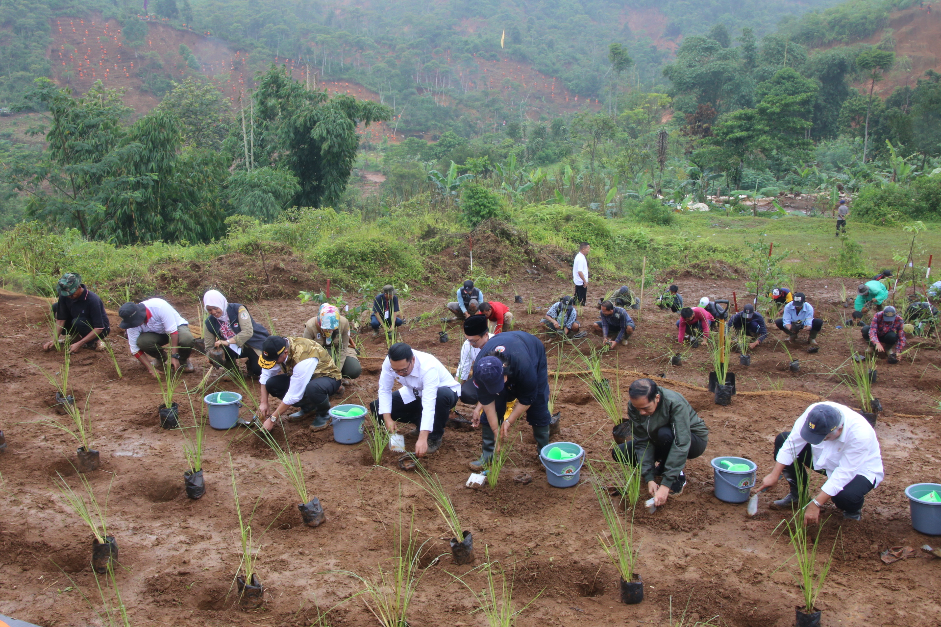 Lebih kurang 92 ribu bibit tanaman telah disiapkan untuk kemudian ditanam di beberapa desa terdampak di Kecamatan Sukajaya. Beberapa varietas yang akan ditanam selain vetiver ialah pohon jengkol, durian, sirsak, pete dan sengon yang bisa dimanfaatkan warga.