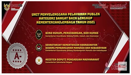KEMENKO PMK – Sekretariat Kementerian Koordinator Bidang Pembangunan Manusia dan Kebudayaan (Kemenko PMK) meraih penghargaan Unit Penyelenggara Pelayanan Publik Kategori Sangat Baik Lingkup Kementerian/Lembaga Tahun 2021.