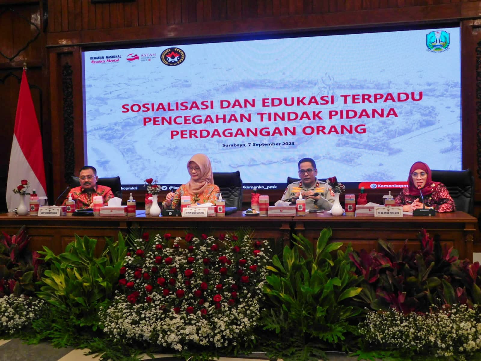 Kemenko PMK  sebagai Ketua II Gugus Tugas Pencegahan dan Penanganan Tindak Pidana Perdagangan Orang (GT PP TPPO) bersama Kemenko Polhukam sebagai Ketua I dan Kepolisian RI sebagai Ketua Harian serta beberapa Kementerian/Lembaga anggota Sub Gugus Tugas yaitu KPPPA, Kemdagri, Kemkunham, Kemenlu, BP2MI, serta Pemda Propinsi Jatim dan Polda Jatim kembali bersinergi, berkolaborasi melakukan sosialisasi dan edukasi pencegahan dan penanganan tindak pidana perdagangan orang tanggal 7 September 2023 yang bertempat di Ruang Binaloka Kantor Gubernur Provinsi Jawa Timur. Kegiatan sosialiasasi dan edukasi sebelumnya telah diselenggarakan di Provinsi NTB dan Kabupaten Buleleng Provinsi Bali.