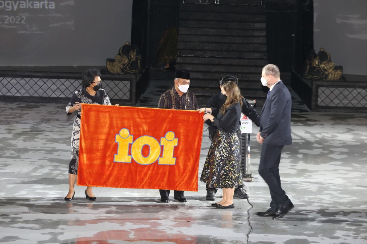 Setelah resmi ditutup oleh Menko PMK, acara dilanjutkan dengan upacara penyerahan bendera IOI kepada Dubes Hungaria Lilla Karsay sebagai tuan rumah IOI ke-35 tahun depan.