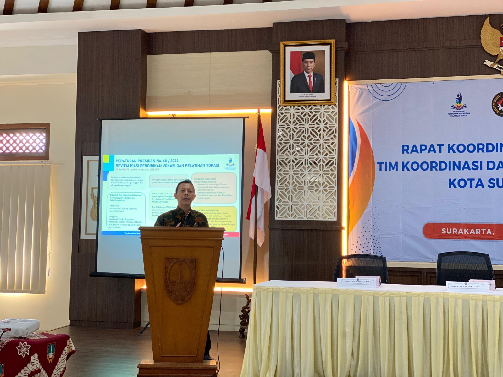 KEMENKO PMK -- Asisten Deputi Pendidikan Vokasi dan Pendidikan Tinggi Kemenko PMK, Ahmad Saufi, menyampaikan apresiasinya kepada Pemerintah Kota Surakarta yang telah membentuk Tim Koordinasi Daerah Vokasi (TKDV). Menurutnya, TKDV sebagai wadah sinkronisasi program pemerintah, akademisi, dan dunia usaha ( triple helix ) ini akan mempercepat proses revitalisasi pendidikan vokasi dan pelatihan vokasi dalam rangka peningkatan kualitas SDM di Kota Surakarta.