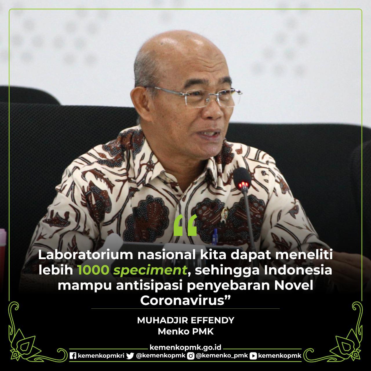 Terkait suspek terduga pasien terinfeksi Covid-19 di Indonesia telah dilakukan pemeriksaan specimen dari pasien-pasien tersebut per tanggal 11 Februari 2020 telah diterima 70 specimen, 68 specimen hasilnya negatif, dan 2 specimen masih dalam proses. Guna lebih memastikan serta meyakinkan proses maupun fasilitas laboratorium yang digunakan untuk pemeriksaan sampel terduga terinfeksi Covid-19, Menko PMK mengunjungi salah satu laboratorium tempat pengujian sampel yang terduga terinfeksi virus tersebut.
