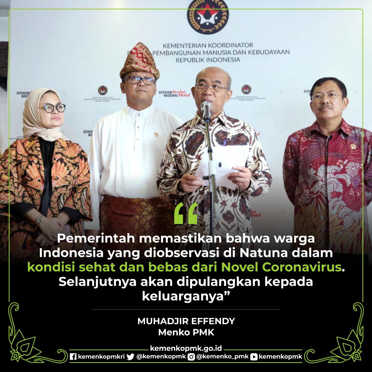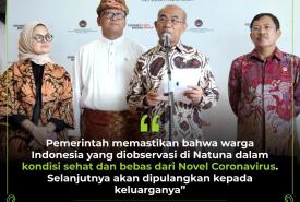 Jakarta (12/2) -- Pemerintah telah melakukan upaya maksimal untuk memastikan Warga Negara Indonesia (WNI) yang didatangkan kembali dari Wuhan, Tiongkok, benar-benar berada dalam kondisi sehat dan terbebas dari Covid-19. Salah satunya melalui proses transit observasi yang dilakukan di Natuna, Kepulauan Riau.
